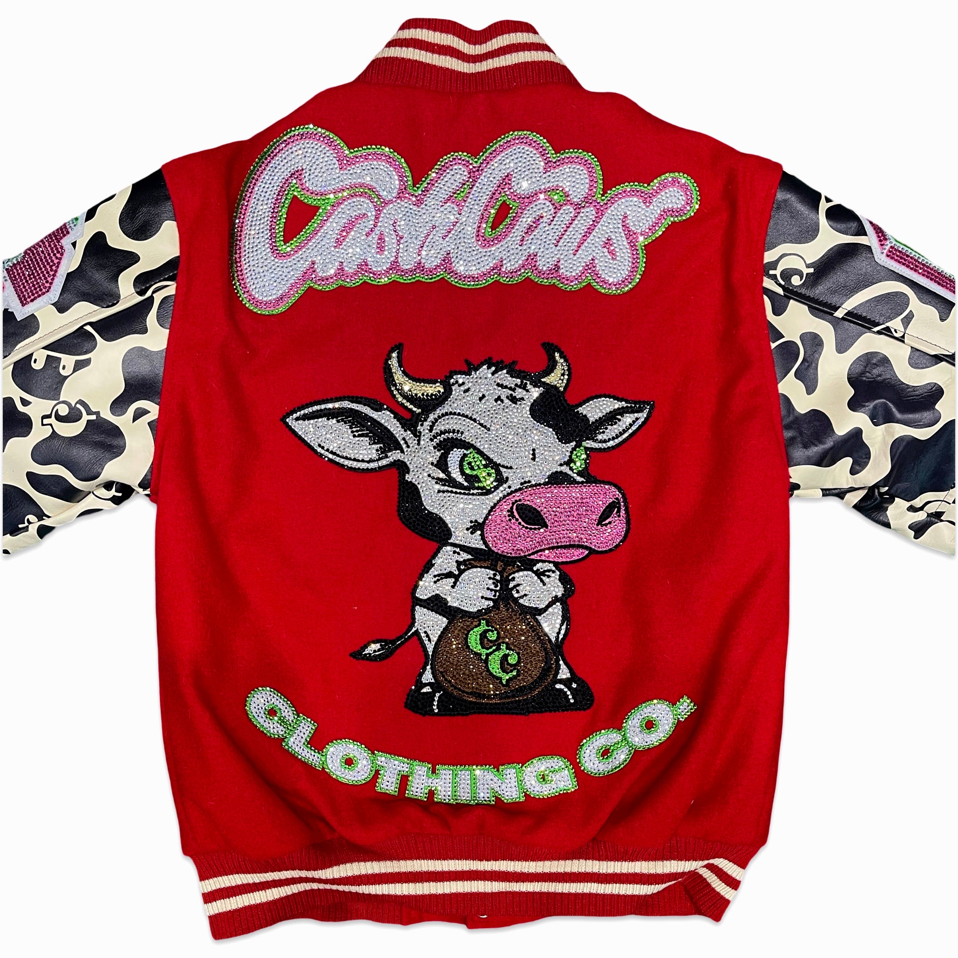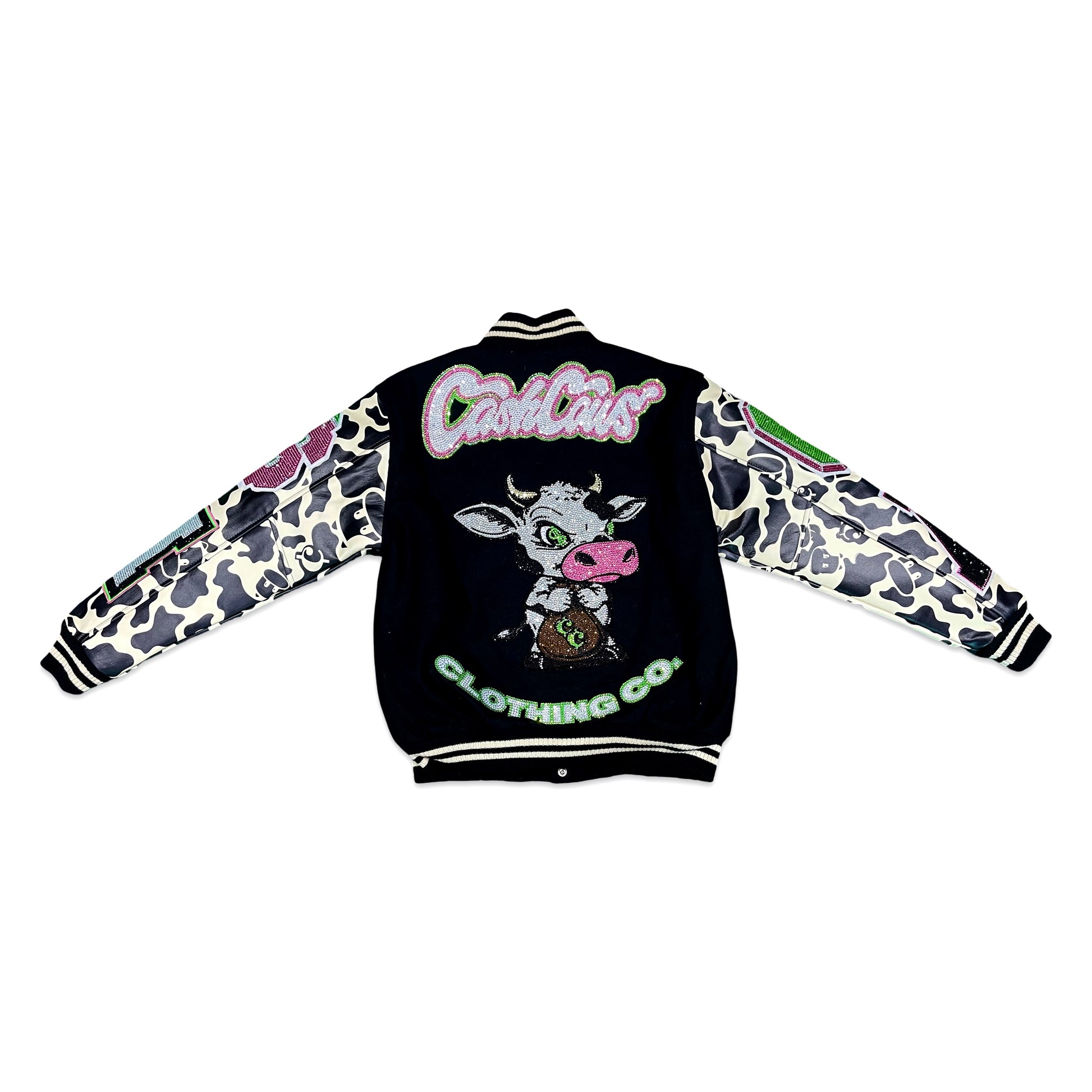 Celebrate Cash Cow Clothes Store's 1-year anniversary in style with this varsity jacket! Made with 24oz melton wool, it features a custom cow print design on the sleeves and is adorned with thousands of high-quality crystals. Cut and sewn for the perfect fit, this jacket is a must-have for any fashion-forward individual.