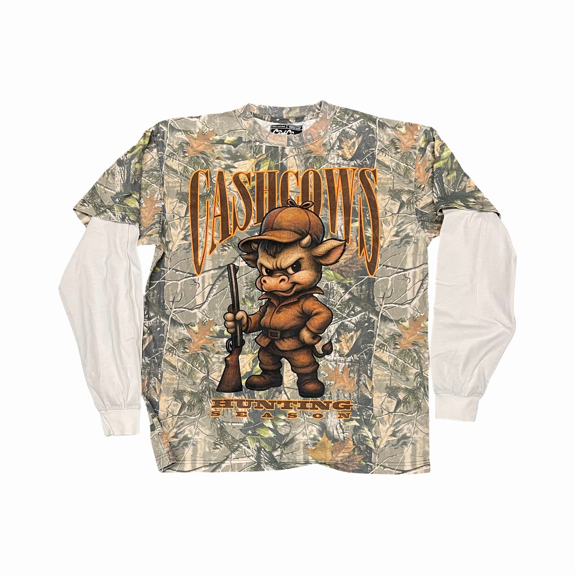 Stay hidden and stylish with our Cash Cow Hunting Club T-Shirt. Our wood camouflage design keeps you concealed while our custom DTG cash cow graphic adds a touch of personality. Get the best of both worlds with this long sleeve tee.